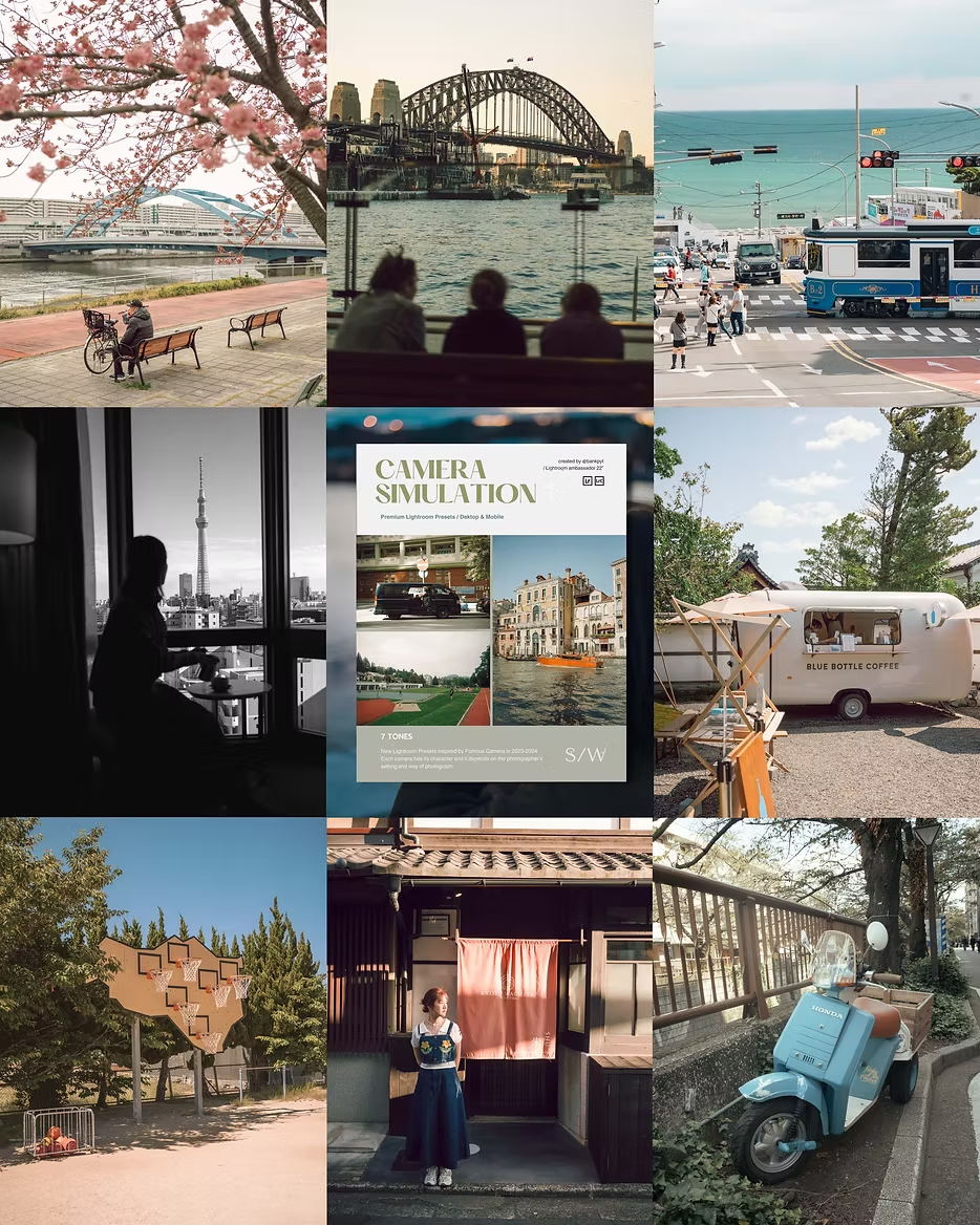 全套包含100个桌面预设(.xmp)+100个移动预设(.DNG),16套风格完整收录:胶片系列(Film 01/02/03、Camera Simulation V.1/V.2)、地域风格(Japan、Korean、Coffee、Earthy、Forest、Ocean)、氛围调性(Cinematic、Dark、Instagram、Travel Essentials V.1/V.2),专为Instagram画廊统一色调优化,人像、街拍、风景、室内场景均适配。